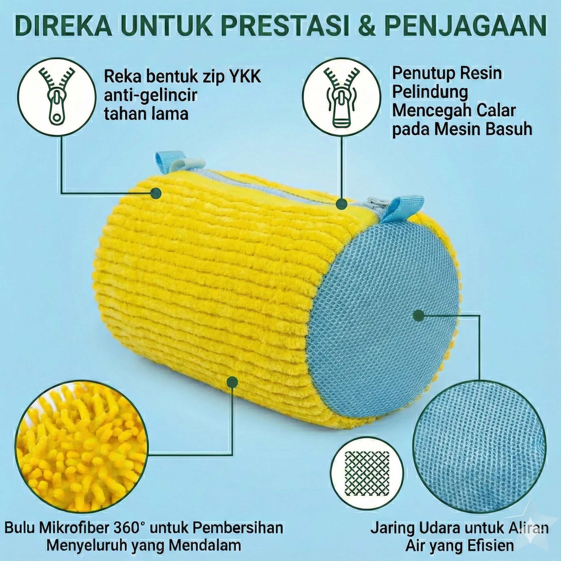Senang je! Just zip your shoes, toss dalam mesin basuh, let it do the work. Tak payah pegang, tak payah sental. It frees you from scrubbing dan jimat masa. Laundry day jadi simple!